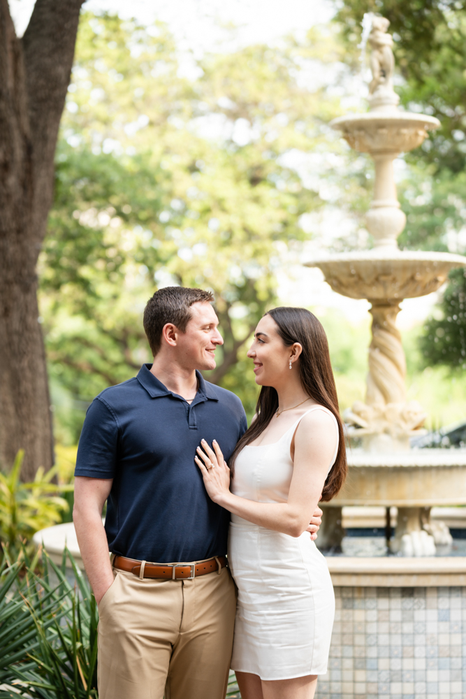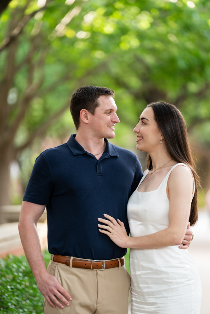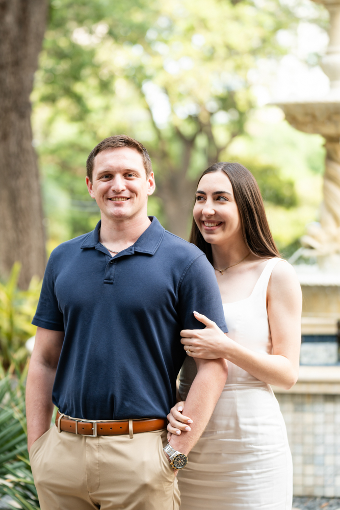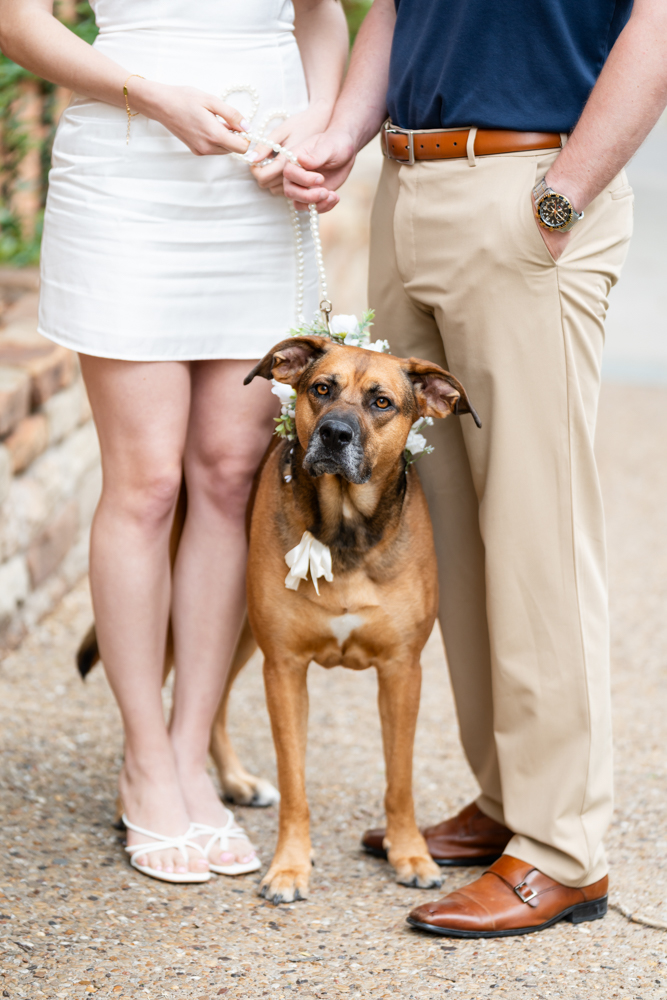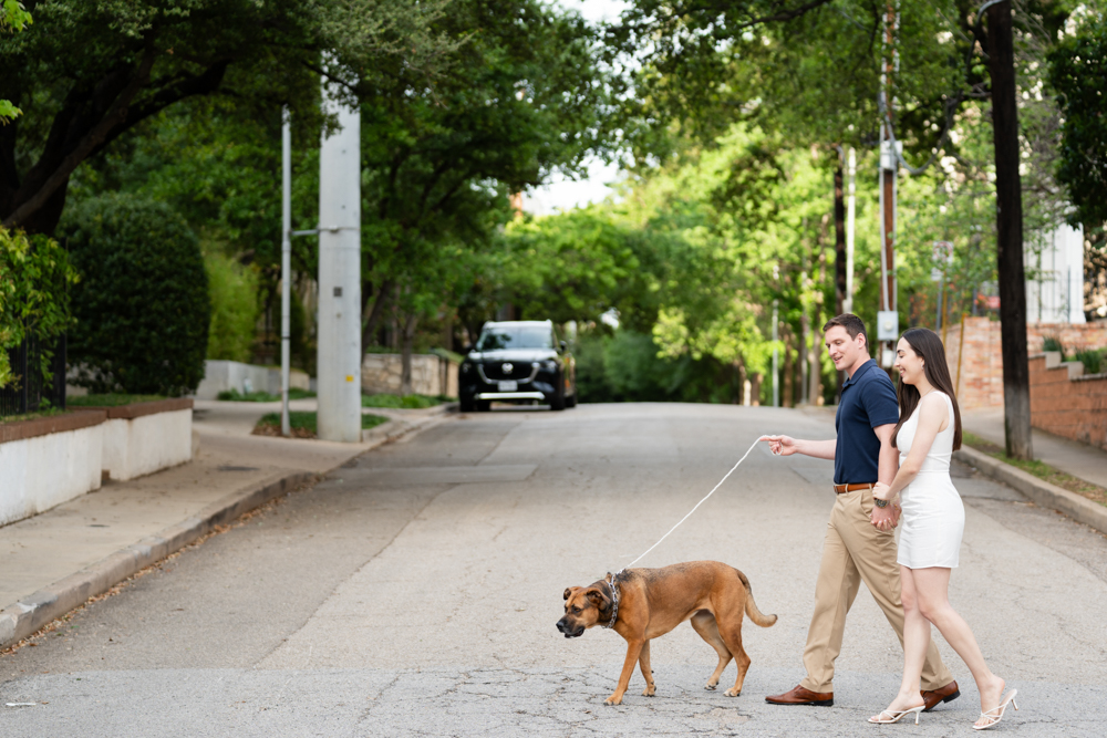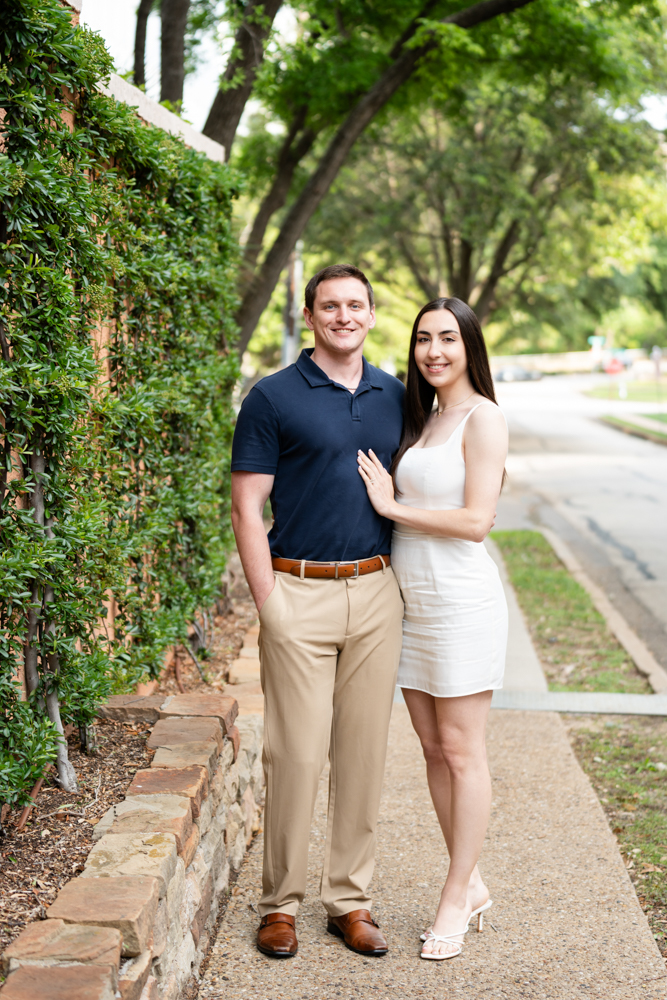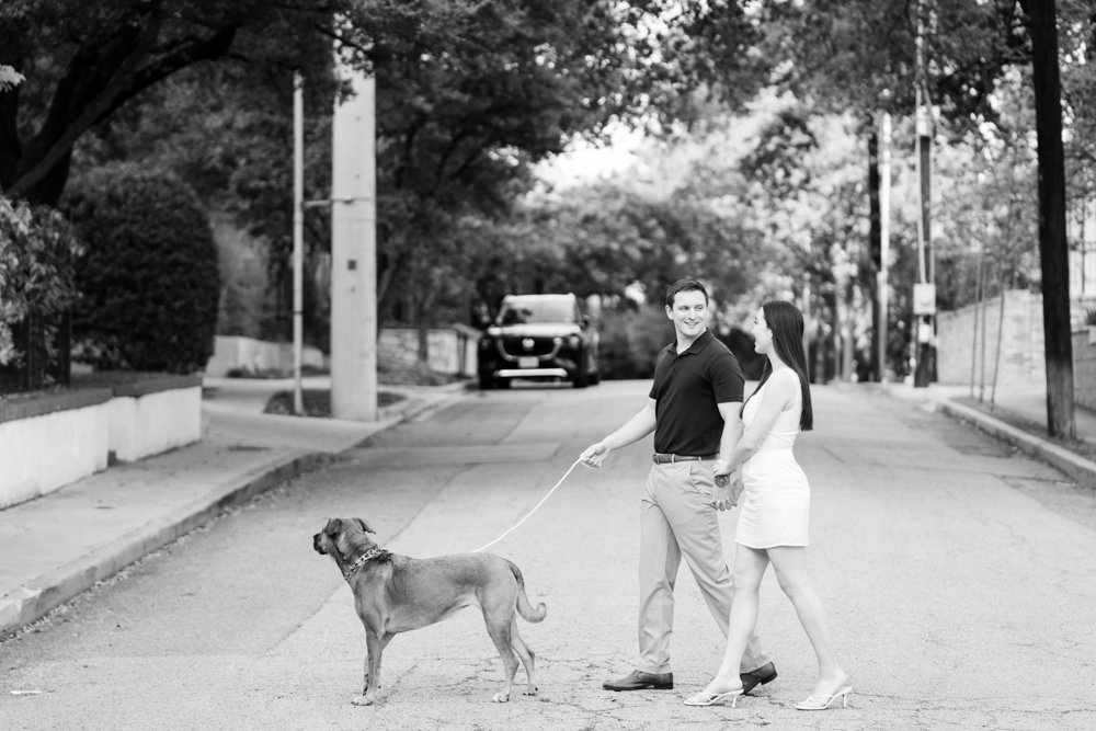 Set against the lush grounds of the Rosewood Mansion on Turtle Creek, their engagement session was filled with vibrant greens, soft light, and the kind of calm joy that comes from simply being present together. And of course, their sweet pup Lola made the day even more personal, adding playful moments and a layer of home to an already beautiful setting.