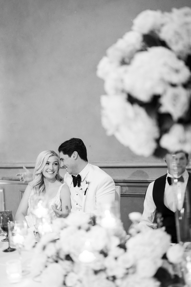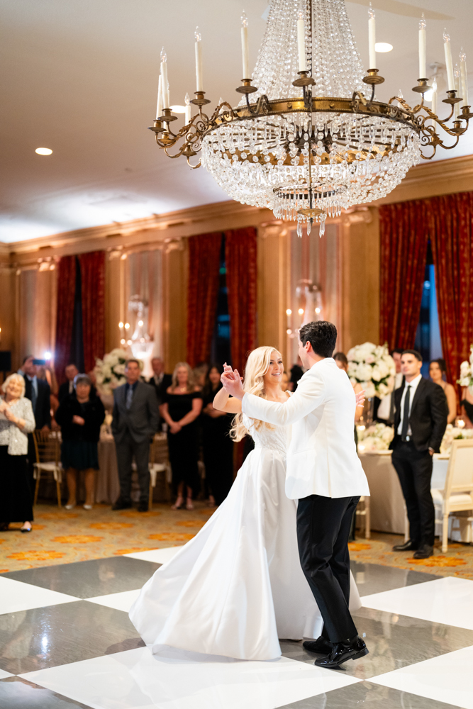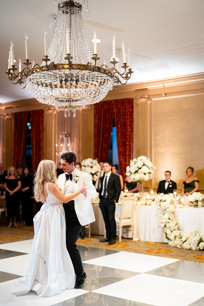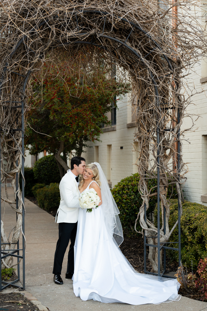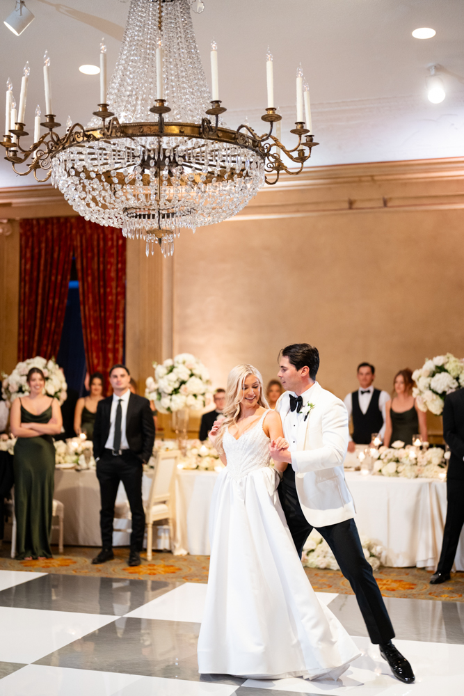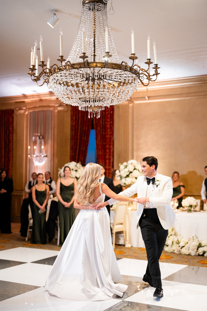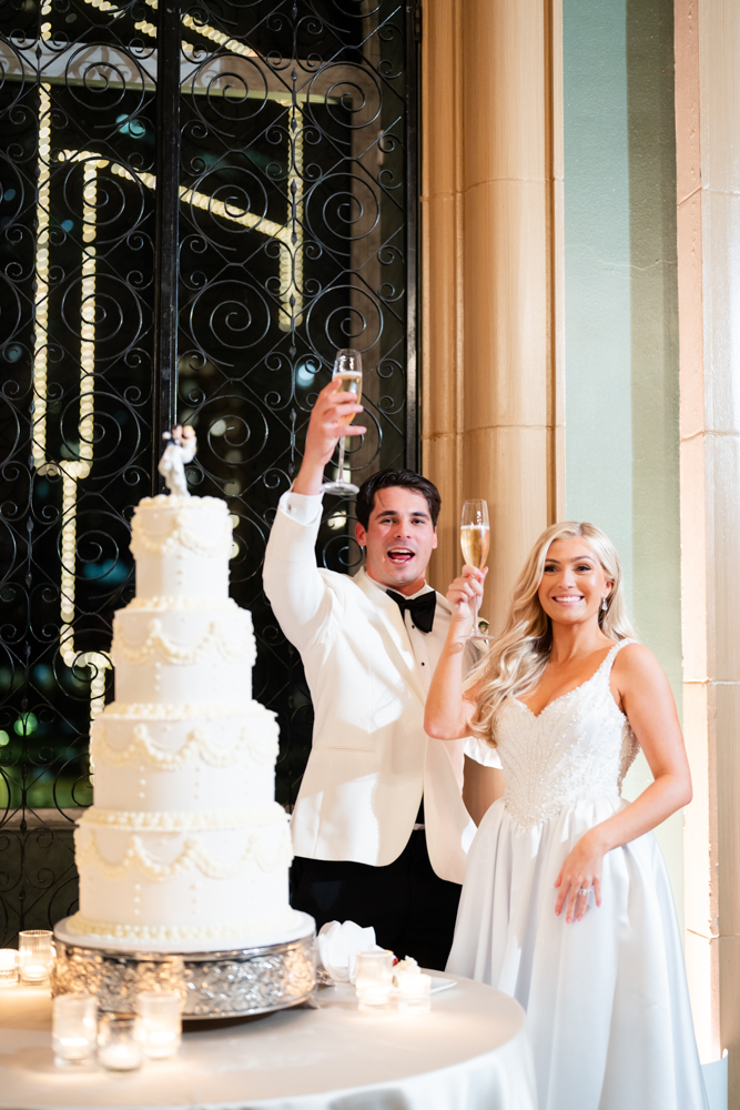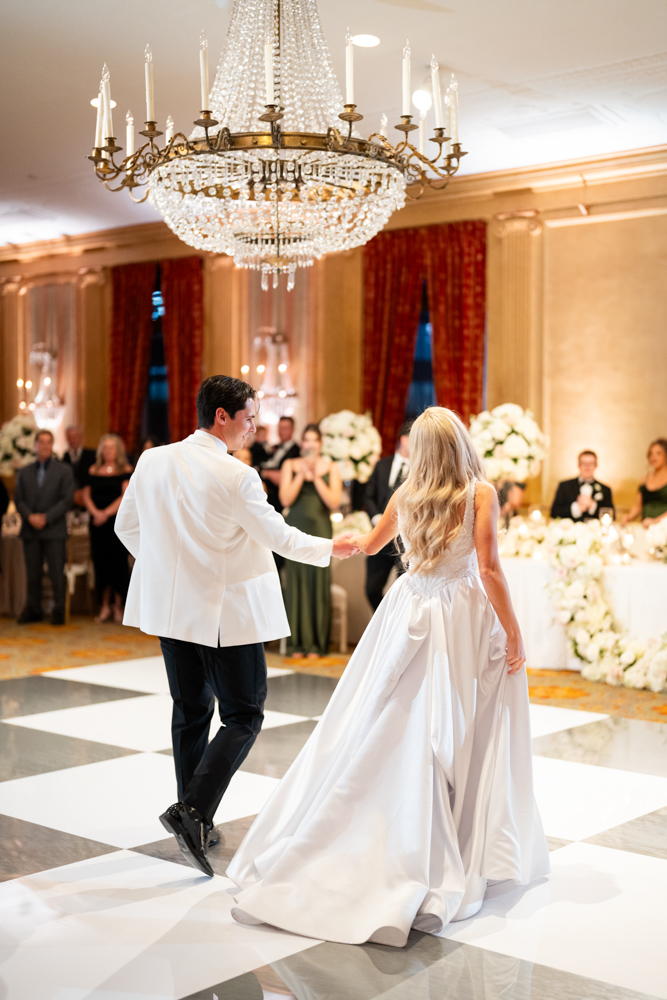 Following the ceremony, the newlyweds returned to The Fort Worth Club for an evening that balanced refined beauty with all-out fun. Plan Revelry created a winter-inspired reception space layered in whites, soft greens, and elegant details. Lush florals by Justine’s Flowers added romance, while mirrored accents and candlelight gave the room a polished glow.