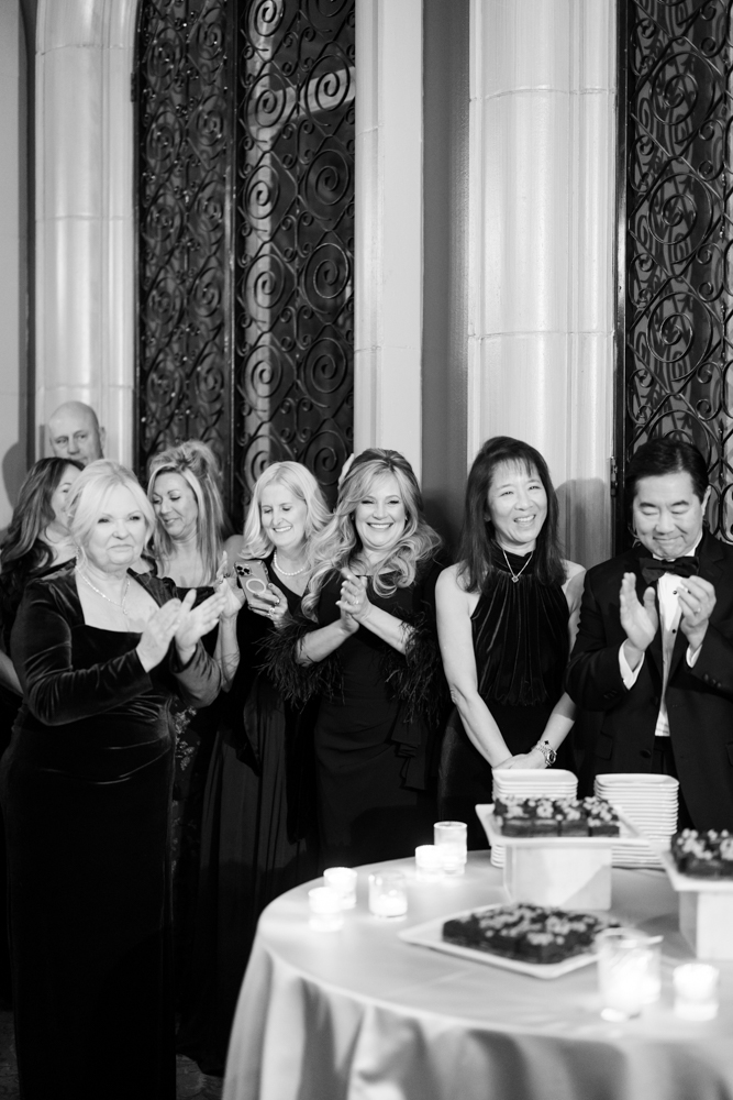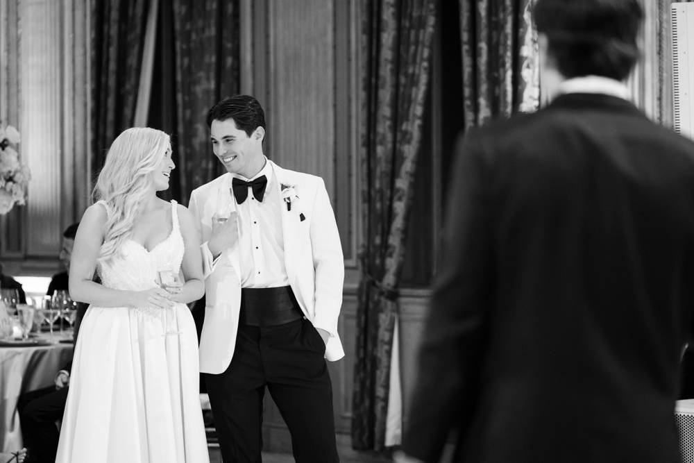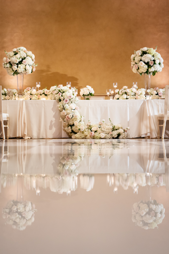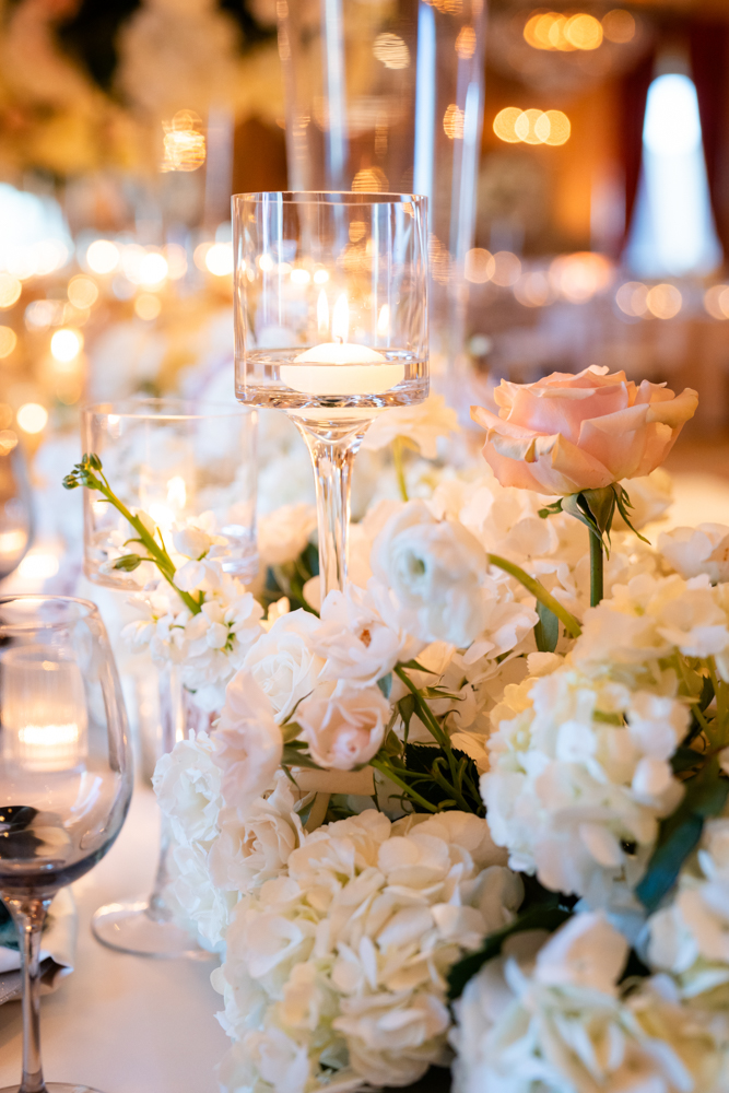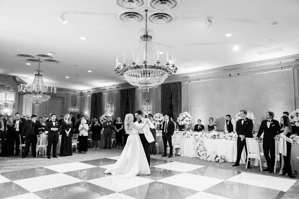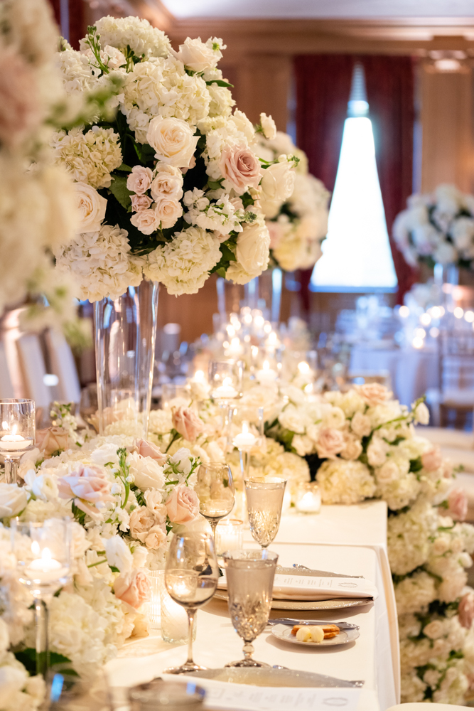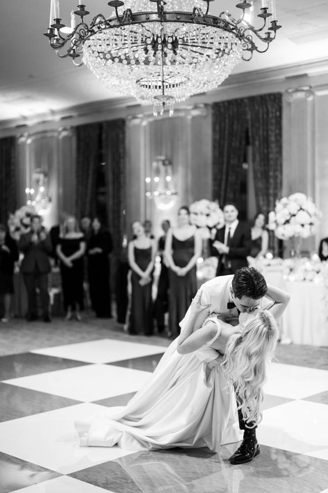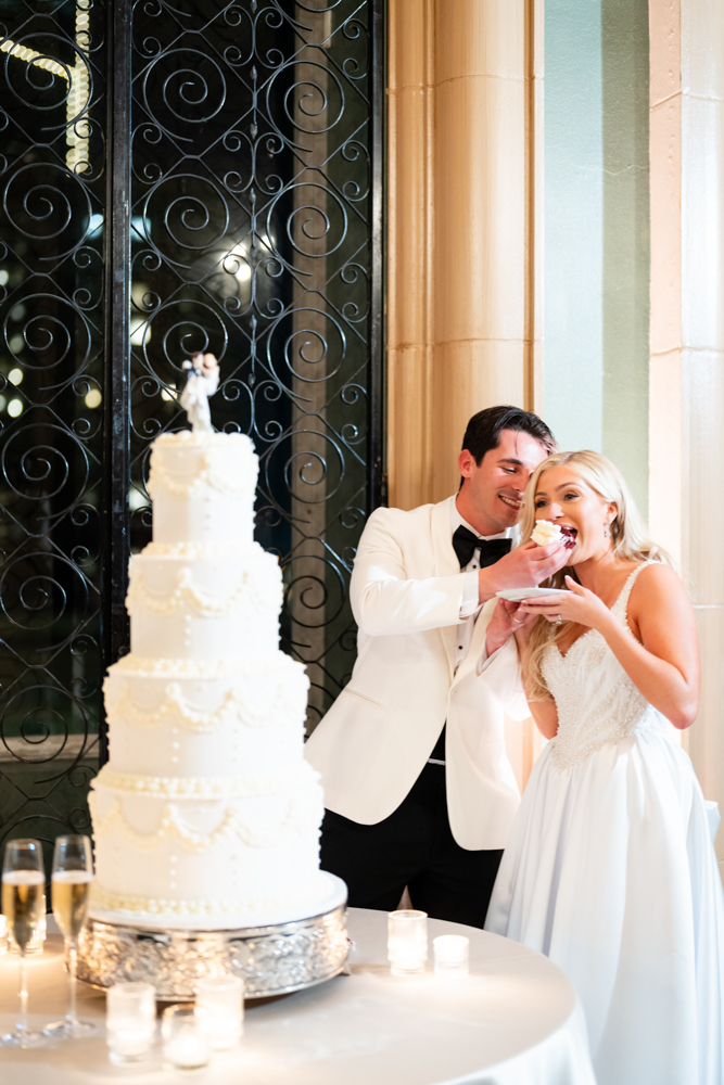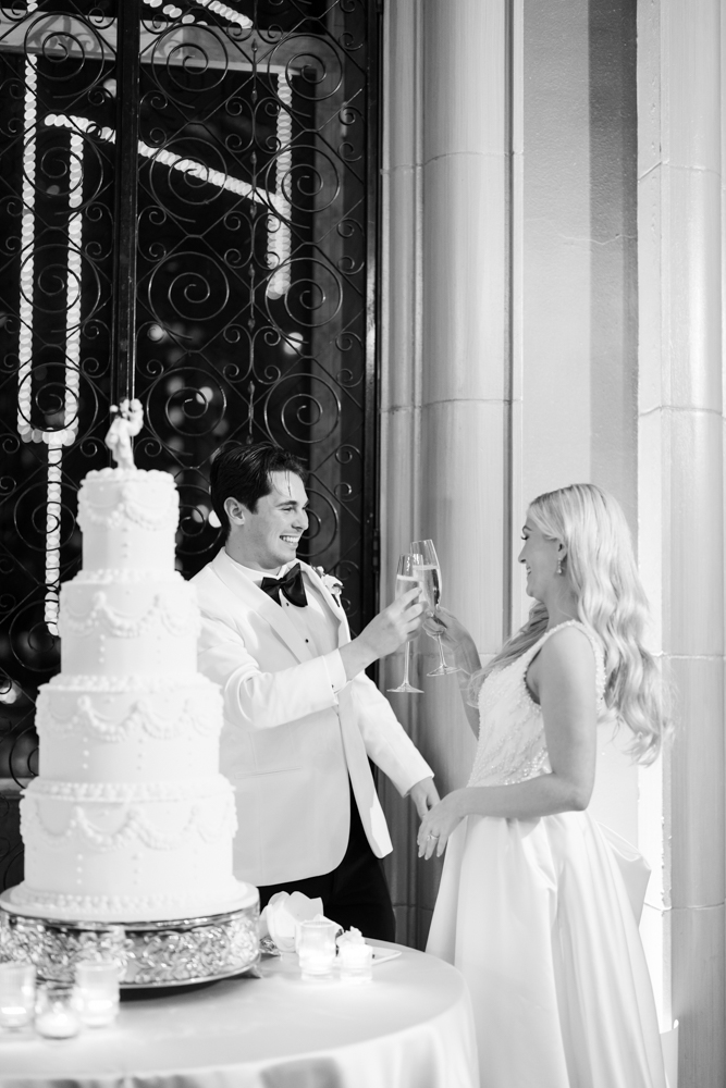 Following the ceremony, the newlyweds returned to The Fort Worth Club for an evening that balanced refined beauty with all-out fun. Plan Revelry created a winter-inspired reception space layered in whites, soft greens, and elegant details. Lush florals by Justine’s Flowers added romance, while mirrored accents and candlelight gave the room a polished glow.