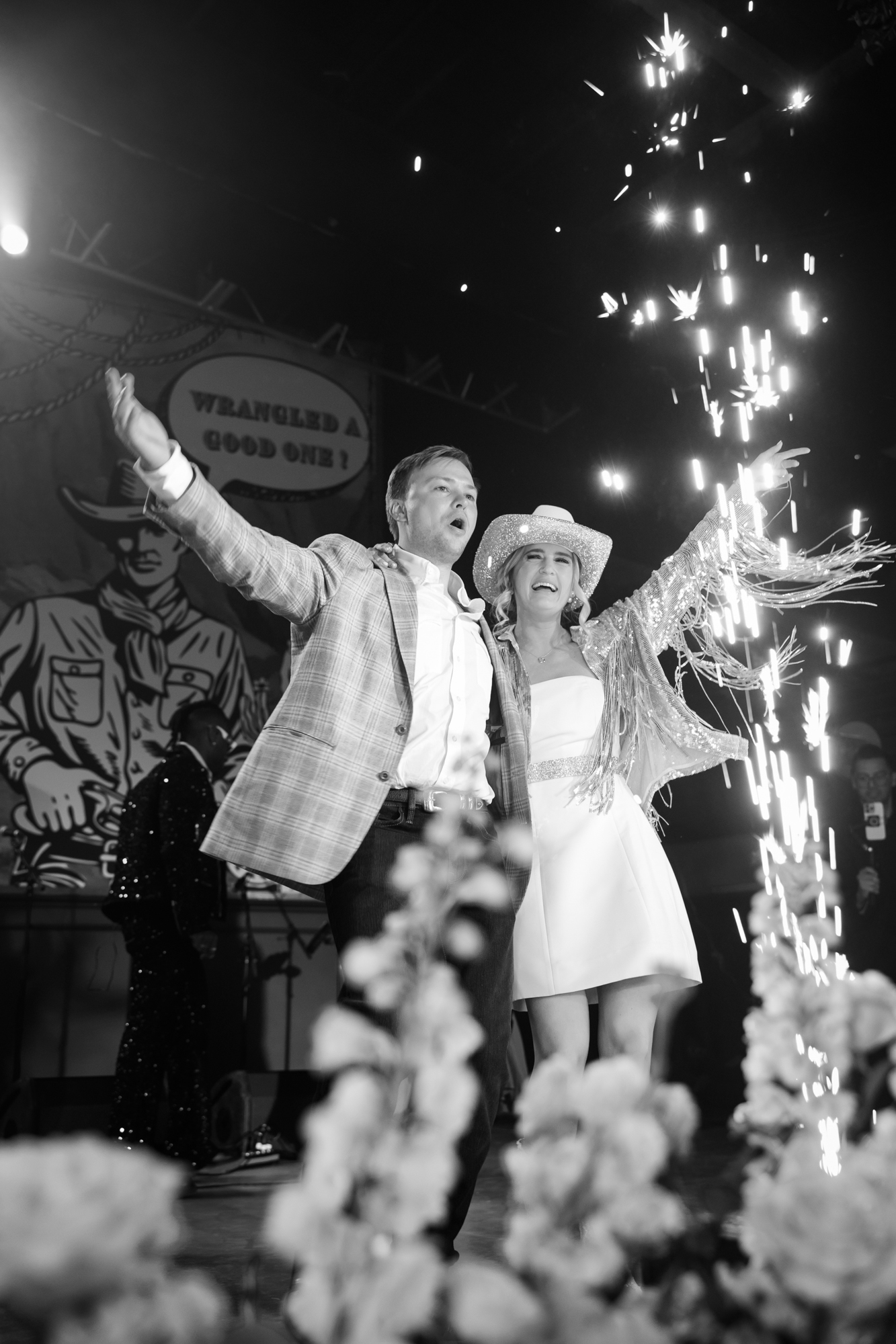 The couple gathered with friends and family for an epic reception that reflected their playful personalities and stylish edge. From the mirrored boots and silver fringe to the incredible floral installations by Gro Designs, the space sparkled with color and energy. Amanda, photographing for Tracy Autem Photography, captured every laugh, dance move, and surprise detail—like armadillo racing, which was an instant crowd favorite.