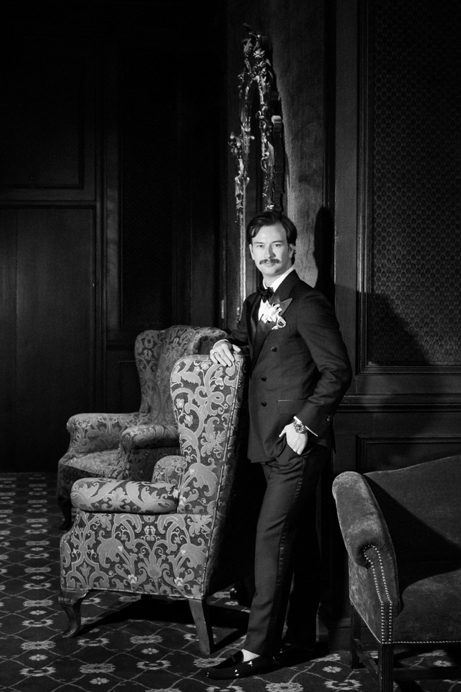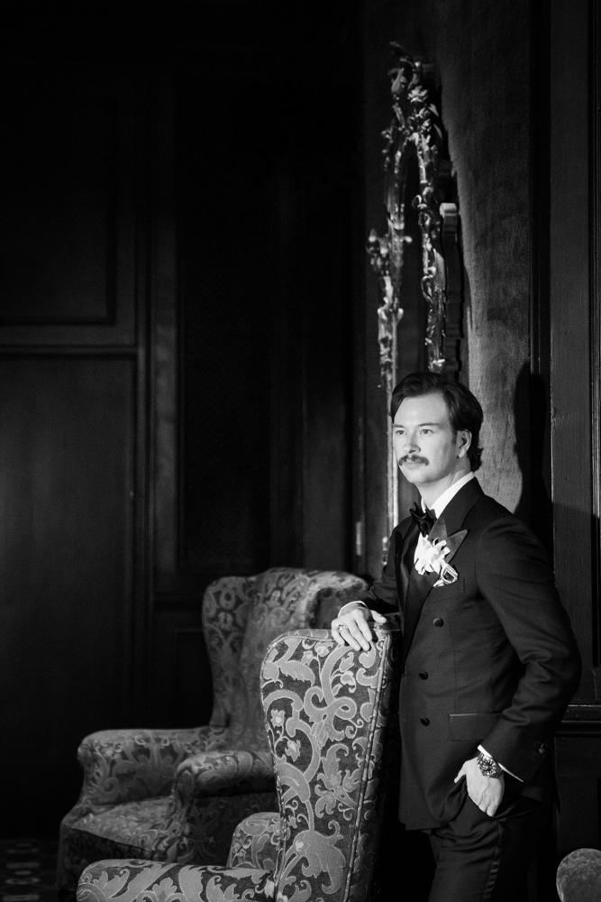 Libby wore a couture Monique Lhuillier gown with a fluted skirt, delicate appliqués, and trailing buttons. For the reception, she changed into a chic Mark Ingram mini dress paired with a vintage Vivienne Westwood pearl choker, a playful shift that set the tone for a lively dance floor celebration.