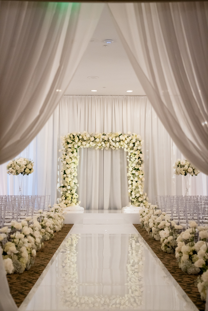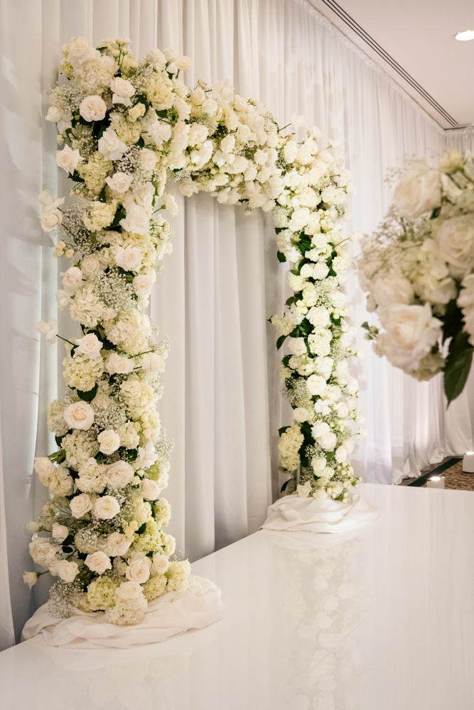 Their ceremony was sacred and heartfelt, complete with a congregational hymn and scripture readings. The reception design embraced a dramatic all-white palette featuring orchids, hydrangeas, and ranunculus, abundant candlelight, and statement floral halos that transformed the ballroom into a romantic, fashion-forward space.