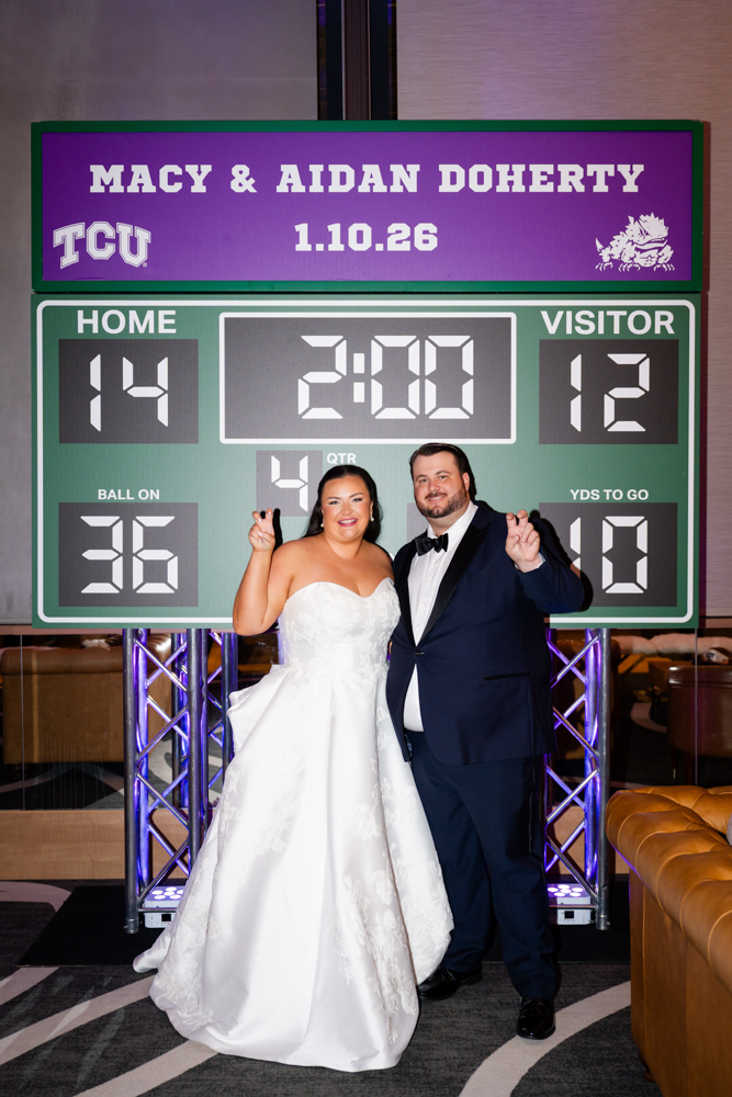 Then it was back to The Crescent for a celebration that was both elegant and wildly fun. Macy and her planner surprised Aiden with a TCU themed lounge area, a nod to his love for the Horned Frogs. It was personal, thoughtful, and such a hit with their guests.