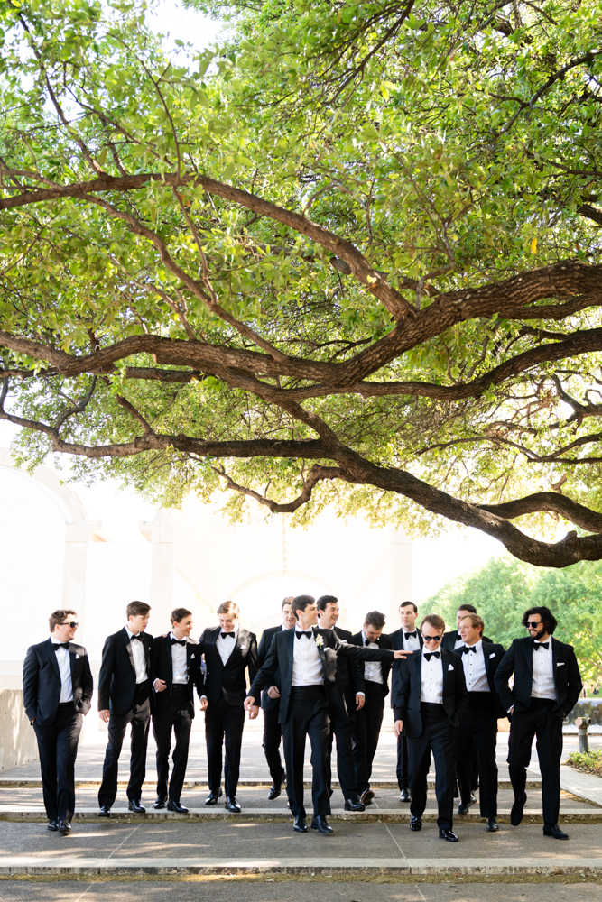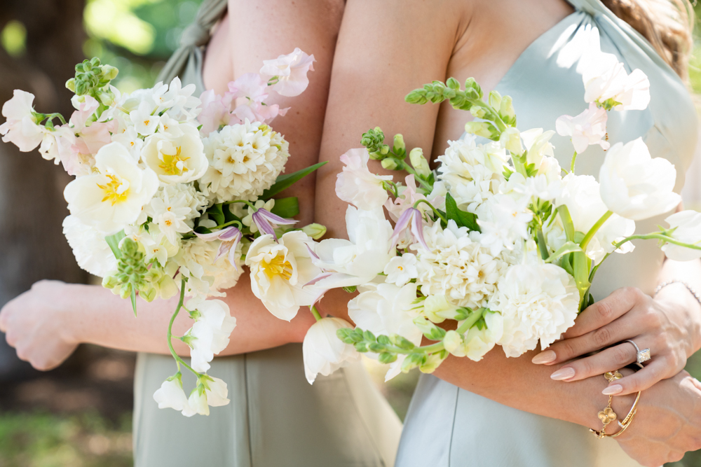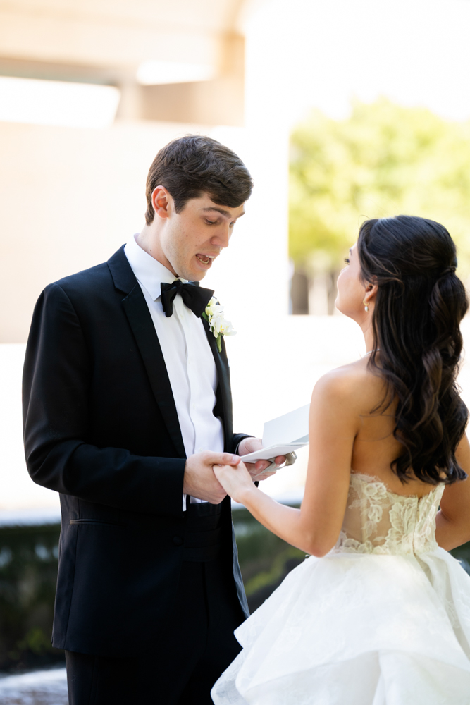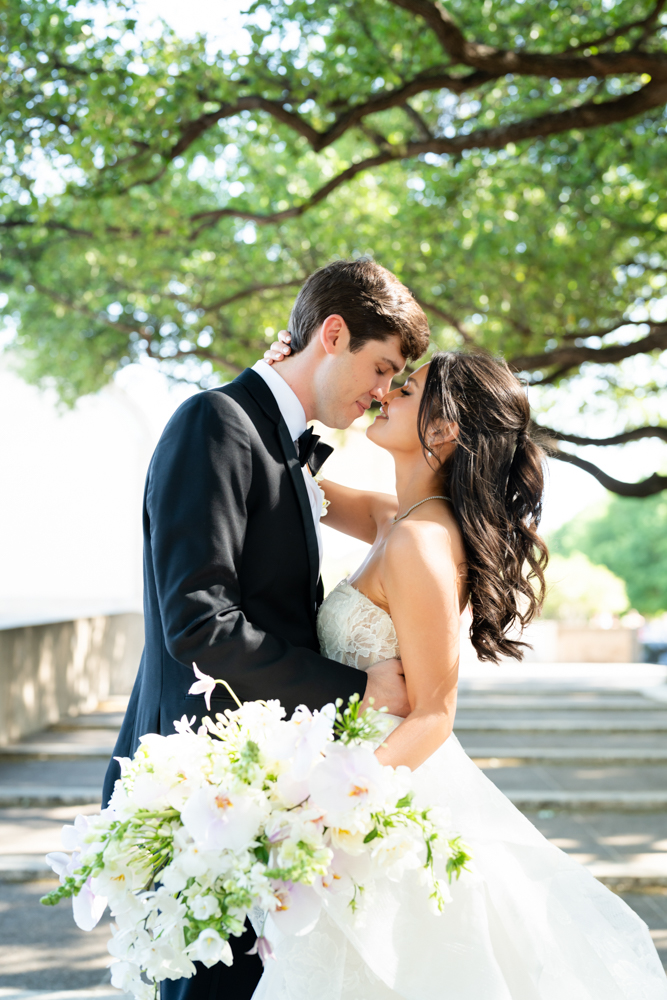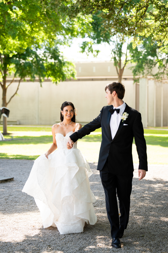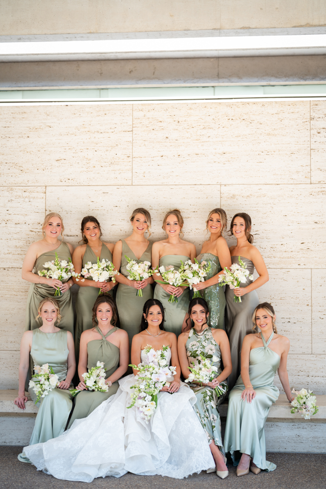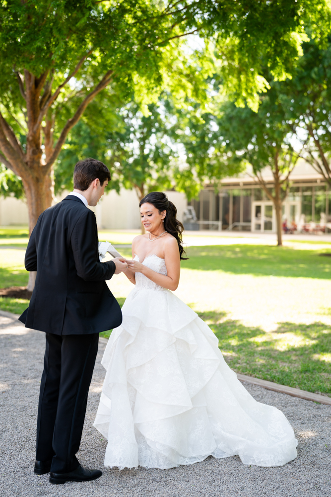 Before the day unfolded, Hannah and Blake shared private vows during their first look at the Kimbell Art Museum. This quiet, emotional moment set the tone for a day rooted in connection and style. Her bridesmaids wore mismatched sage dresses, perfectly complementing lush florals with touches of blush and lilac by Justine’s Flowers.