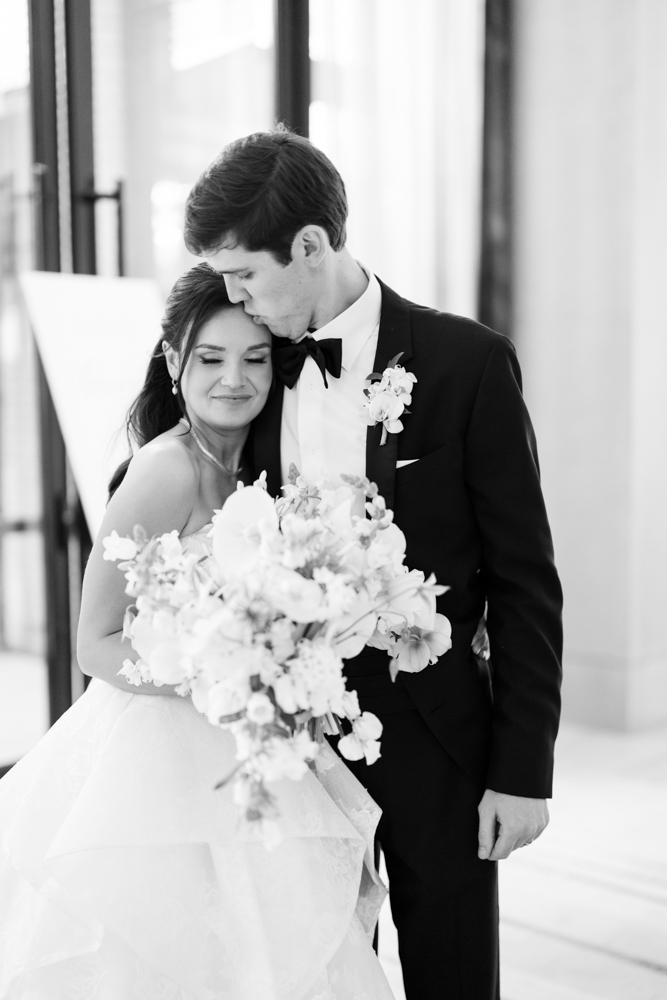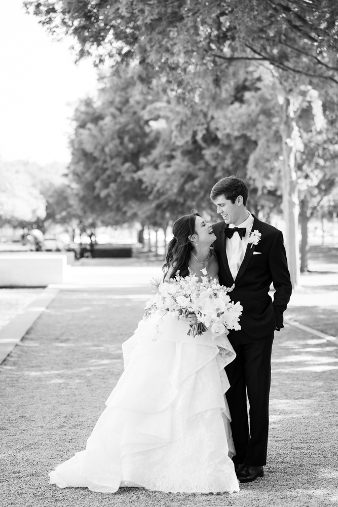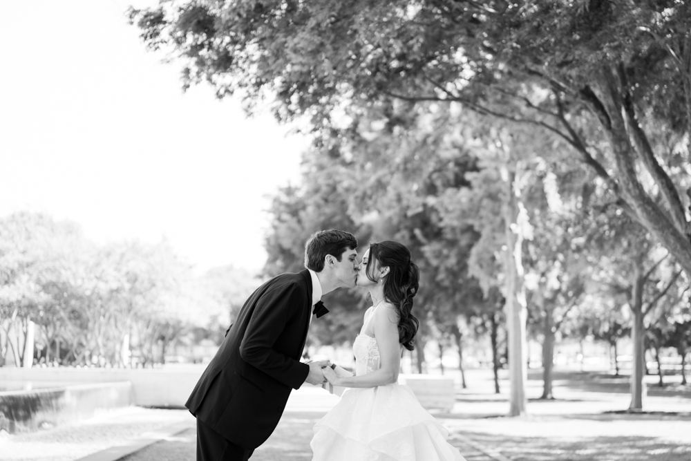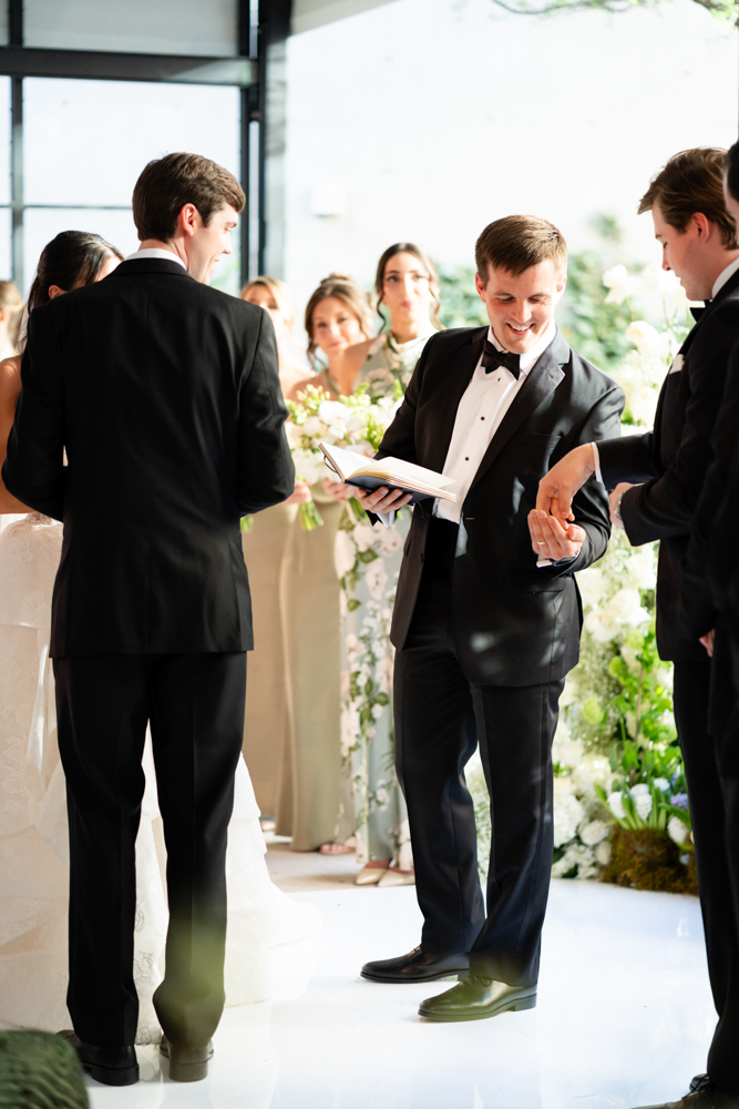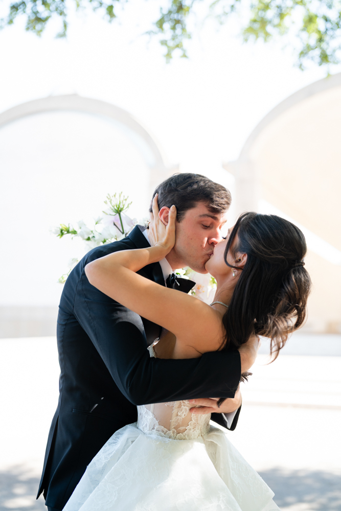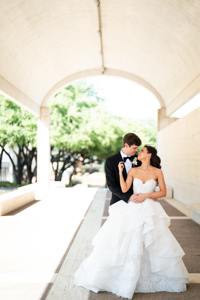 Before the day unfolded, Hannah and Blake shared private vows during their first look at the Kimbell Art Museum. This quiet, emotional moment set the tone for a day rooted in connection and style. Her bridesmaids wore mismatched sage dresses, perfectly complementing lush florals with touches of blush and lilac by Justine’s Flowers.