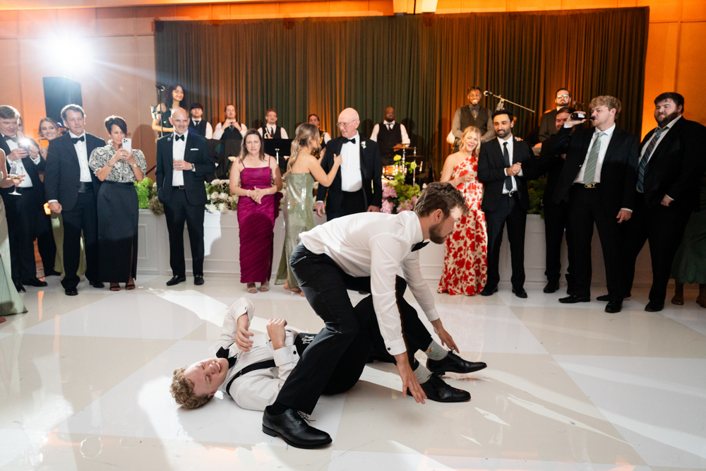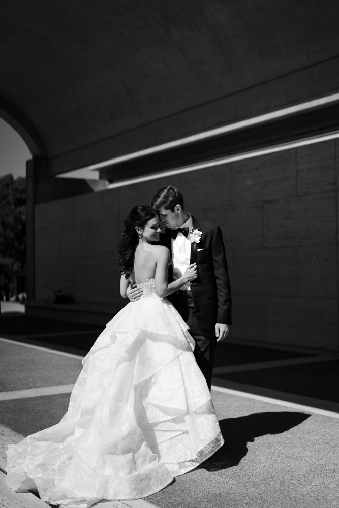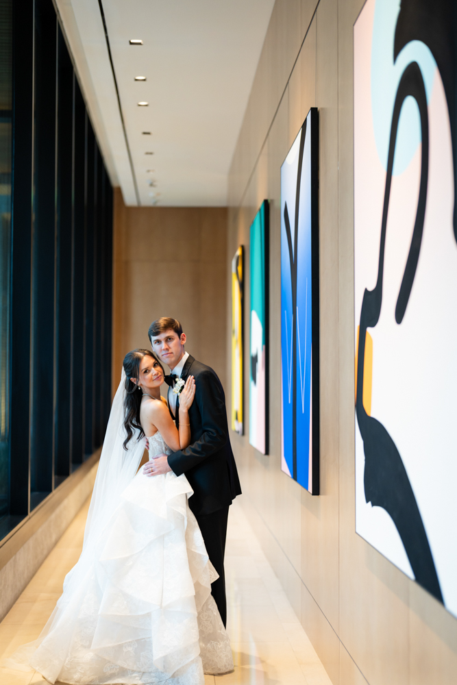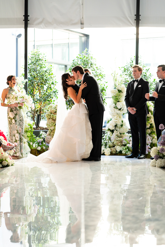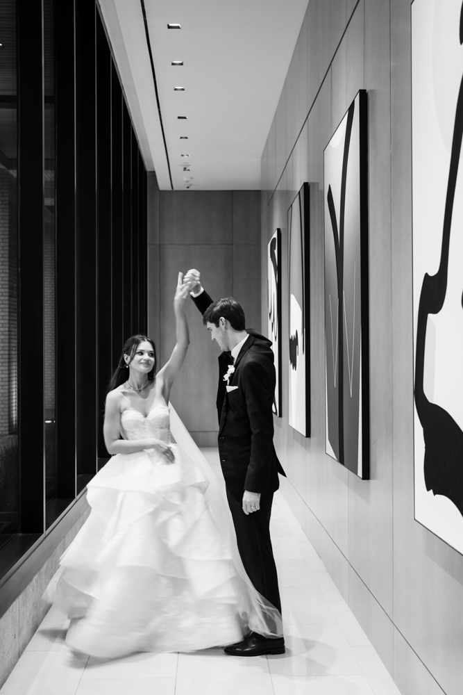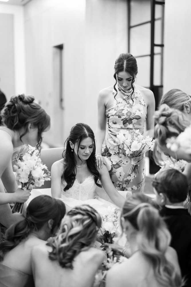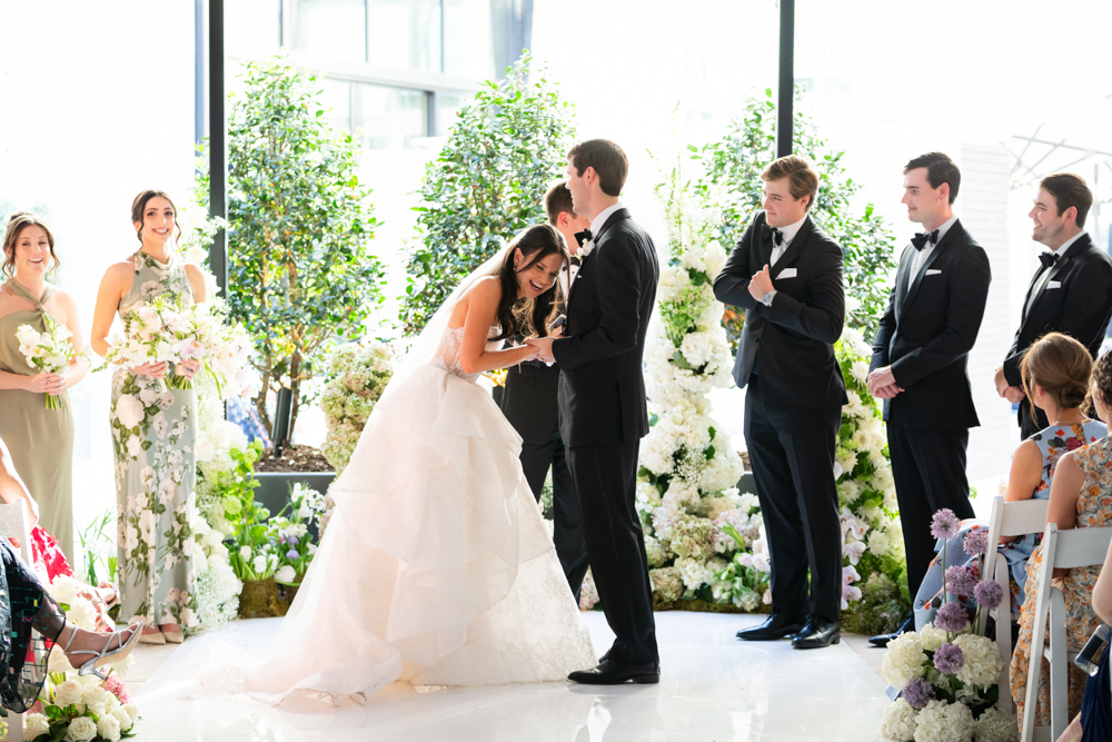 Before the day unfolded, Hannah and Blake shared private vows during their first look at the Kimbell Art Museum. This quiet, emotional moment set the tone for a day rooted in connection and style. Her bridesmaids wore mismatched sage dresses, perfectly complementing lush florals with touches of blush and lilac by Justine’s Flowers.